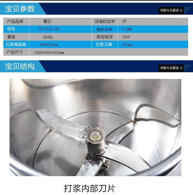 36型高速制冷打漿機技術參數:打漿桶直徑360mm ,外觀和大小與36型慢速制冷打漿機是一樣的,電機功率7.5kw 壓縮機功率3p。
