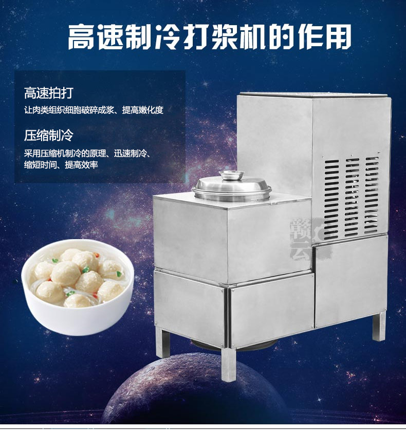 本設備采用304不銹鋼材質加工設計,在原高速/慢速打漿機的基礎上,將3P制冷壓縮機嵌入打漿機內,解決了高速/慢速肉丸打漿過程中因拍打破碎等工序引起升溫改變肉質難題,制冷效果顯著,產品一經推出,倍受肉制品加工商企客戶青睞。