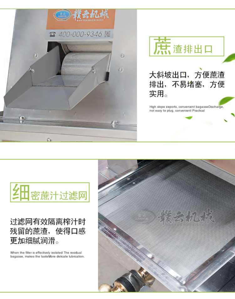 贛云系列電動甘蔗榨汁機用于榨甘蔗汁和水果榨汁之用,采用壓榨原理將甘蔗汁和甘蔗渣分離出來,也可稱為甘蔗榨汁分離機,榨出來的甘蔗汁味到甜美,營養豐富,榨汁率高達95%以上。