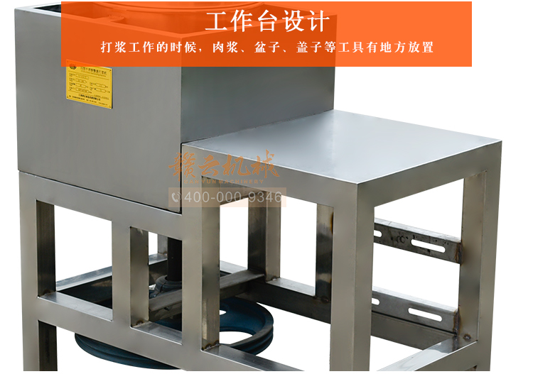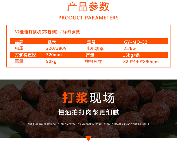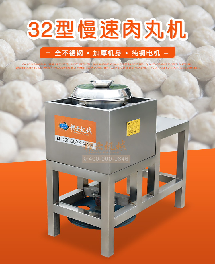 慢速肉丸打漿機(jī)有普通型和全不銹鋼型,本款為全不銹鋼系列32型慢速肉丸打漿機(jī),打漿桶直徑320mm,一次可打肉漿15kg左右。通過大皮帶輪減速拍打肉漿,打出的肉漿更有彈性,適合魚丸、牛肉丸和貢丸的制漿之用。