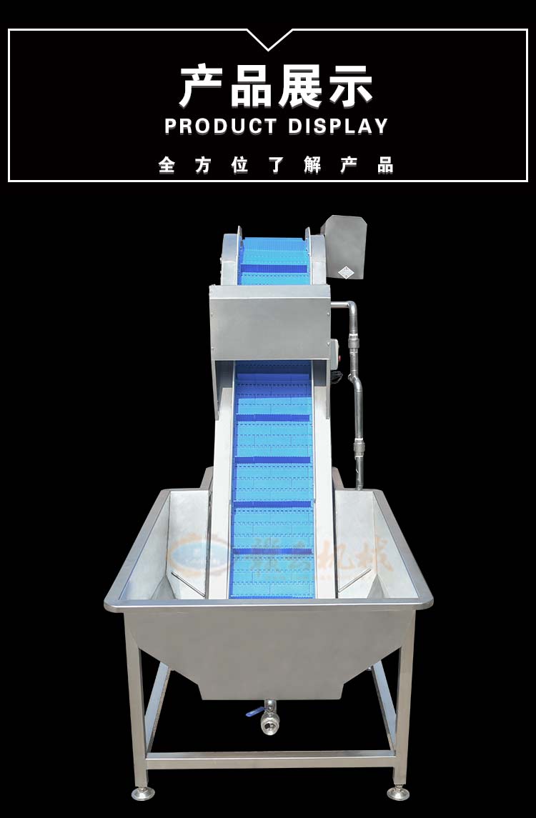 本機主要起提升和輸送的作用,浸泡清洗機是由水箱和提升機組合而成的機械,物料先倒入水槽后浸泡,在由提升機進行提升給下一道工序。解決人工入料困難的問題;在流水生產線中,該設備通常和其他入料口要求高的設備搭配使用,滿足生產的自動化的需要。該機具有操作簡便、結構緊湊、造型美觀、維修方便等優點。
