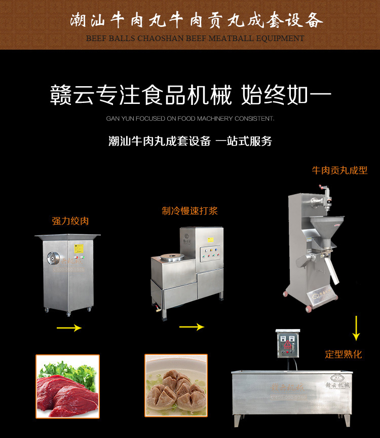 潮汕牛肉丸成套設備,本套設備專為潮汕牛肉丸加工定制,采用強力碎肉、慢速拍打、貢丸成型、自動熟化和真空包裝設備組合而成,適合潮汕人加工正宗潮汕牛肉丸用,改傳統工藝為機械化生產潮汕牛肉丸,1-2人只需1個小時即可完成日常加工一天工作量或十多人的產量。時產50kg潮汕牛肉丸。