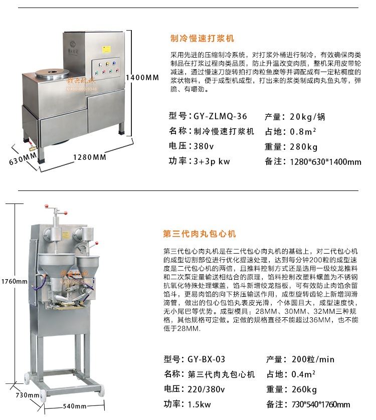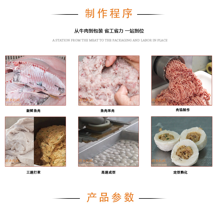 本套設備技術參數如下:立式不銹鋼絞肉機用于絞豬肉做肉末肉餡,200不銹鋼采肉機用于采取新鮮魚糜,然后通過制冷慢速打漿機攪拌成魚漿和肉餡,放入包心肉丸成型機中成型,后經過雙加熱水槽定型熟化。
