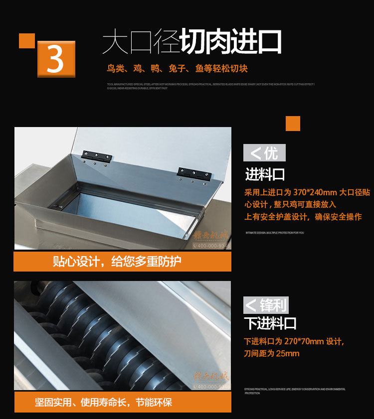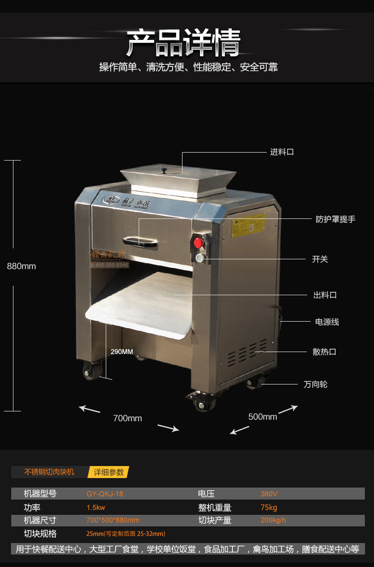 贛云304不銹鋼家禽商用切塊機,豬肉切條機,采用雙滾帶鋸齒切刀設計,針對整雞、鴨、兔等小型帶骨家禽具有很好的切割分解之用,速度快效率高,可切出長條形塊狀物,刀片采用特殊鋼材加工,鋒利堅固耐用,是中央廚房商用家禽分解設備。