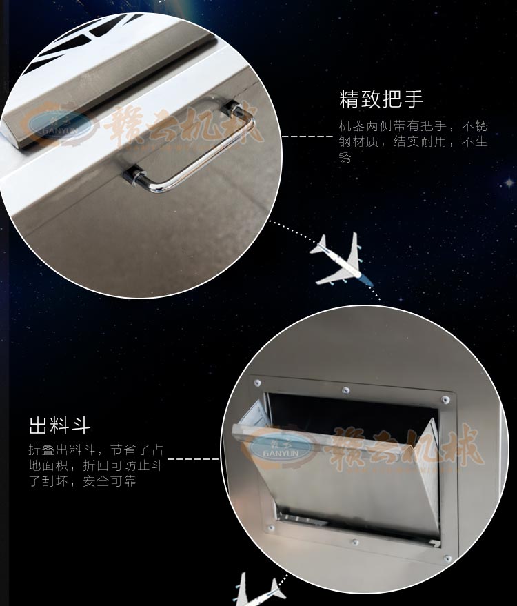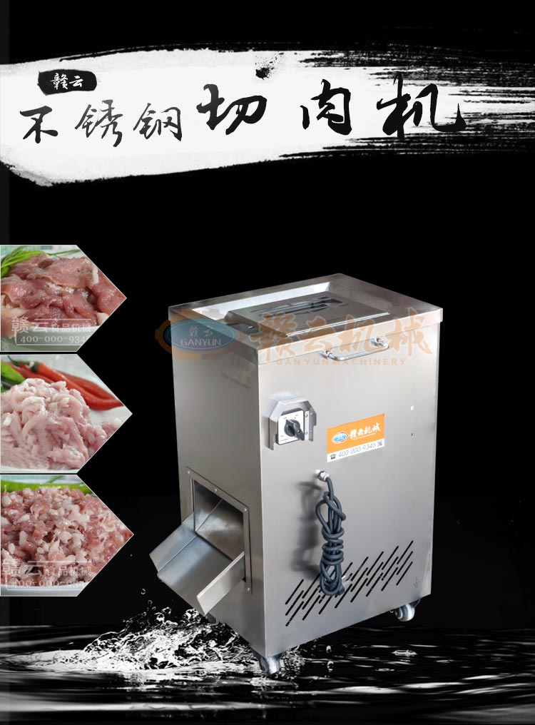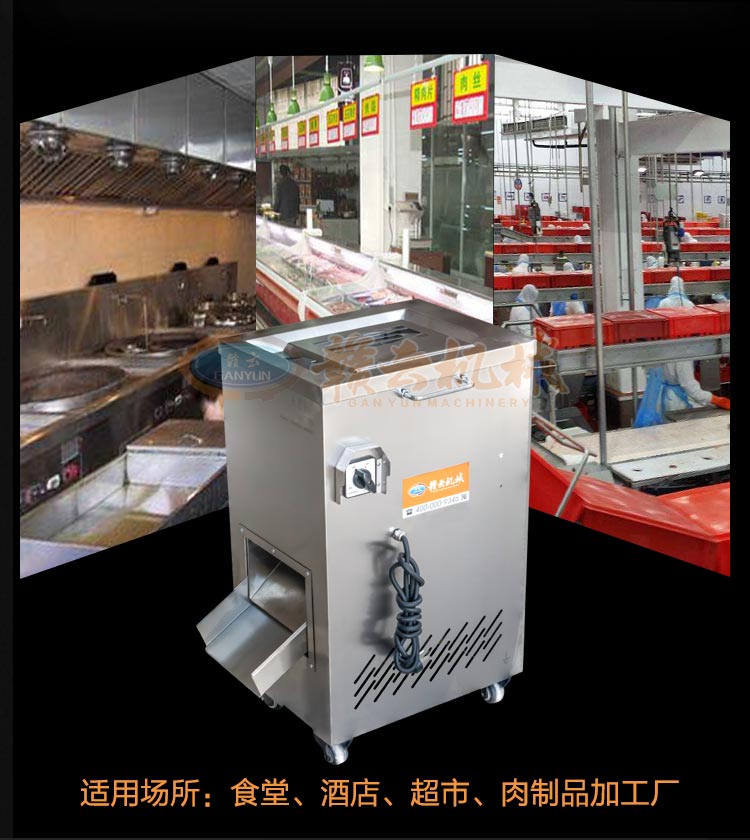 不銹鋼切肉機不銹鋼切肉機,進料口鏤空設計,方便看到下料進度,進料口防護蓋板材加厚,堅固耐用。鋒利刀片,刀間距3.5mm,切切肉片、肉絲、肉粒。防水旋鈕開關。折疊出料口,節省空間,推回可防止料斗刮壞。側板拆卸可看到電機。304不銹鋼機身,兩個萬向輪,兩個非萬向輪,容易固定,省心。