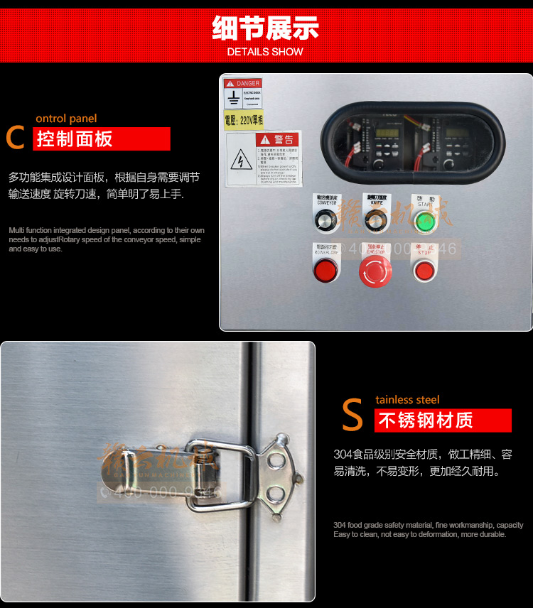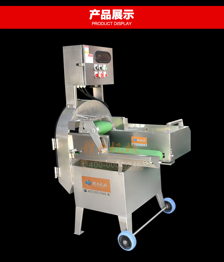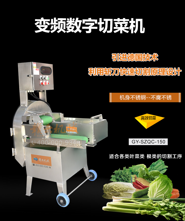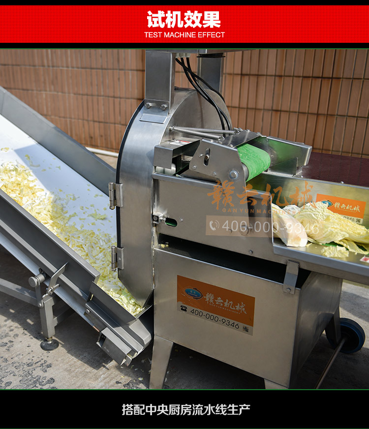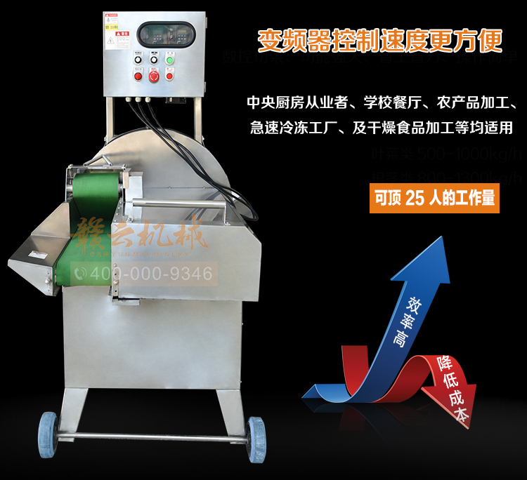 中央廚房凈菜加工設備之一_贛云牌150型數字切菜機,引進先進技術,利用斬刀快速切割原理設計,適合各類葉菜類,球根類的切割工序,1-60mm范圍內變頻可調,適合多元化中央廚房參與食堂切配之用,贛云機械,掌握肉丸加工成套設備,中央廚房凈菜設備核心技術,咨詢電話400-000-9346