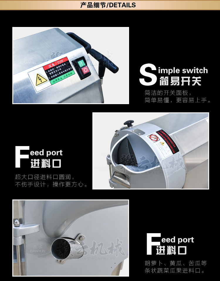 多功能切菜機就只有啟動按鈕和關停按鈕,沒有其它繁瑣的按鍵,無需經驗也可以熟練的操作,讓人很快就能適應的實現整臺設備的運作,讓機器在使用時不存在技術性的問題,讓整臺切菜機實用便利!