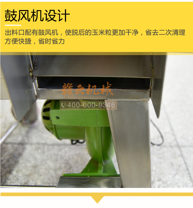 出料口配有鼓風機使脫后的玉米粒更加干凈、美觀。