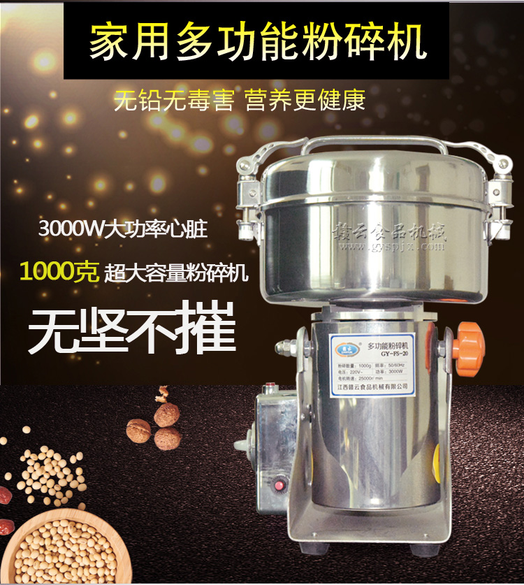 贛云系列中藥五谷粉碎機又稱打粉機,采用超高速純銅電動機帶動粉碎刀快速將物料打成粉碎狀,固又稱之為高速粉碎機,打粉機,我廠生產(chǎn)的多功能粉碎機可容納100克-2500克不等產(chǎn)品。這是一款1000克快速開蓋式粉碎機。