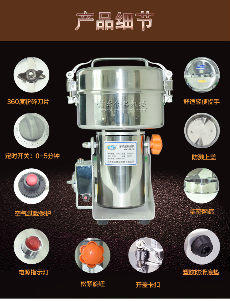贛云系列多功能粉碎機采用純銅高速電機帶動粉碎刀片將物料快速打成粉末,可用于粉碎五谷、雜糧、田七、阿膠、白叁等,一般粉碎時間1-2分鐘即可,新款粉碎機改保險絲為空氣過載保護(hù)器,使用更安全,我廠提供的粉碎機有100克-2500克不同型號的多功能粉碎機。