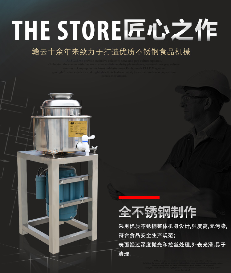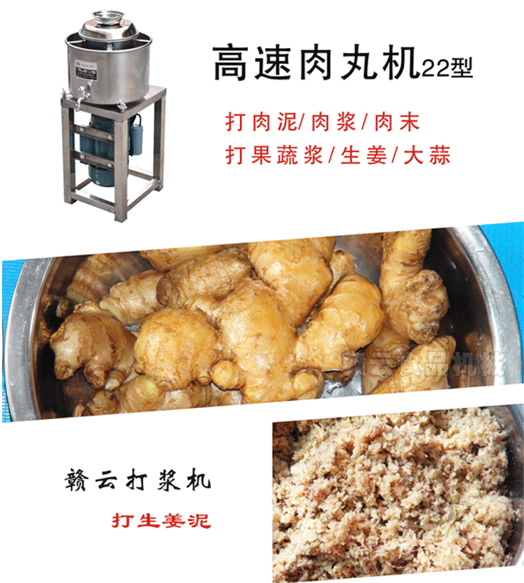 贛云牌新款全不銹鋼肉丸機,22型肉丸機采用全不銹鋼材質,在舊款全不銹鋼肉丸機的基礎上給支撐架加粗加厚,用不銹鋼蓋,打漿雙桶,刀柄刀片均采用不銹鋼材質。打漿桶裝肉量2l,一次可打肉漿4斤左右,采用2800r/min高速電機,故稱之為高速肉丸機。
