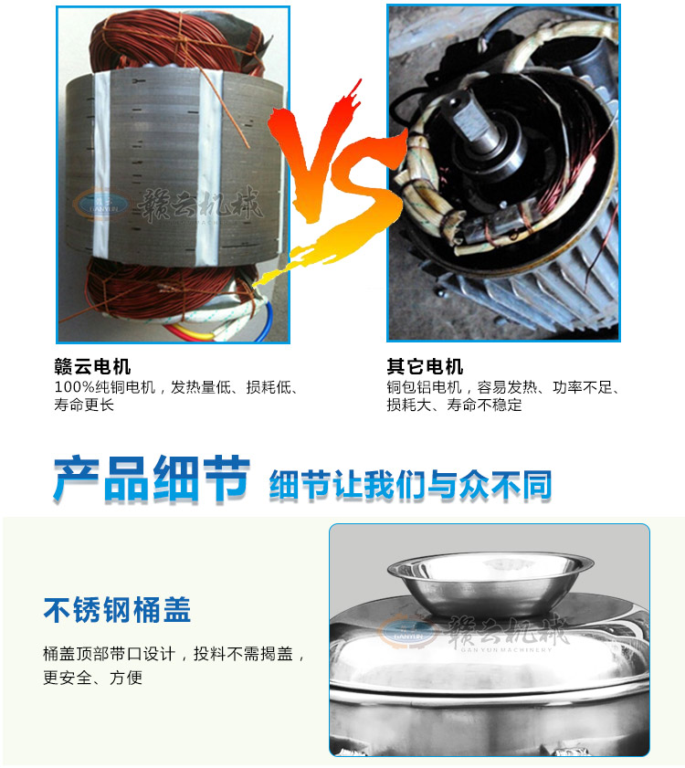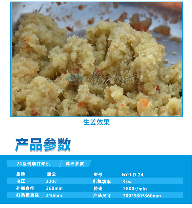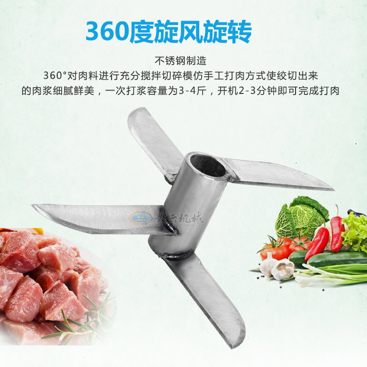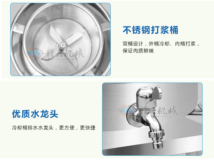 傳動系列肉丸機現目前全部配備拉升不銹鋼雙打漿桶,針對老款打漿底部肉漿不宜翻轉而改進。新款更具美觀性,24型傳動肉丸打漿機一次可打5斤左右肉漿,1-2分鐘即可完成打漿,打漿過程外桶加冰或冰水可對內桶起冷卻作用,有效防止肉漿因打漿升溫而破壞肉類組織細胞,同時打漿雙桶和電動機錯位設計,可有效保護電機。