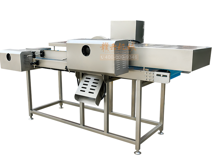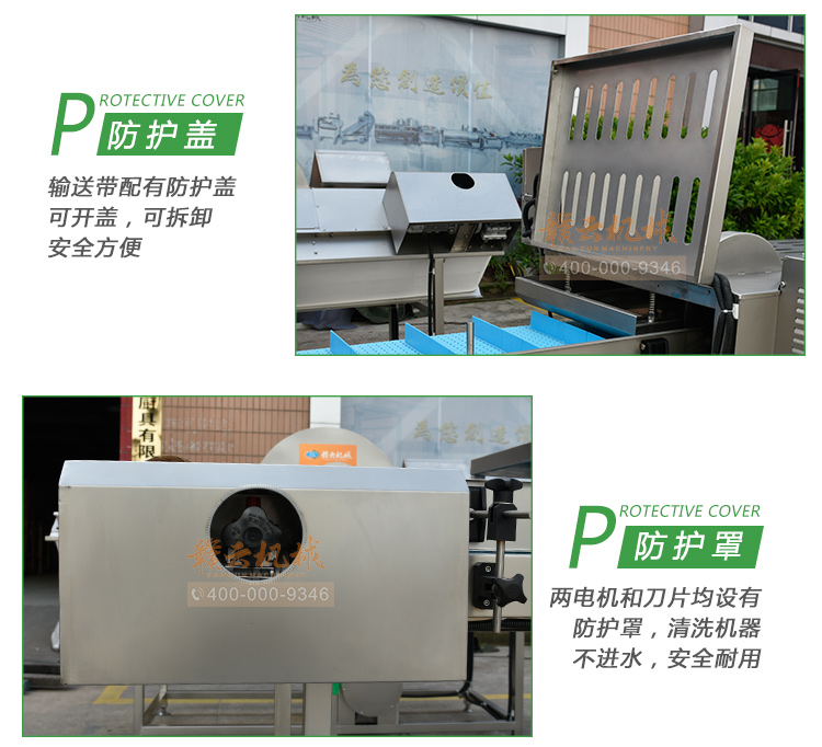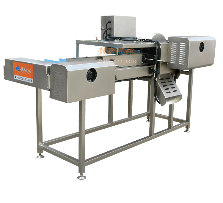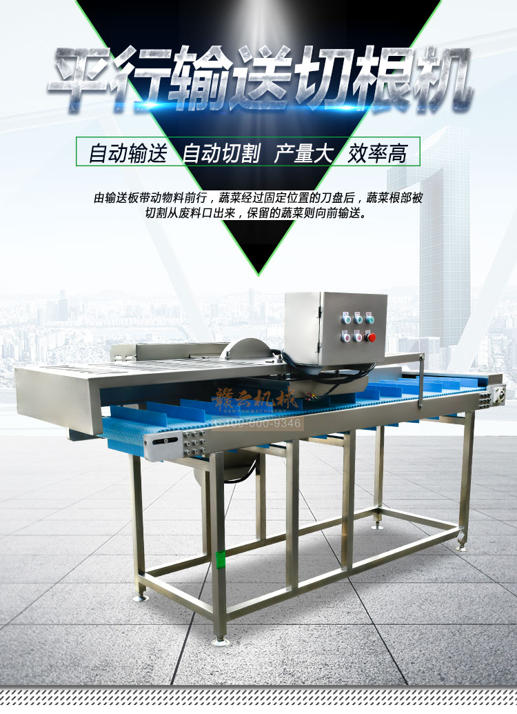 平行輸送去根機由輸送板帶動物料前行,蔬菜經(jīng)過固定位置的刀盤后,蔬菜根部被切割從廢料口出來,保留的蔬菜則向前輸送。切割的長度可以調(diào)節(jié),每顆蔬菜所切割出來的廢料都相等。去根機適合大型食品加工廠、凈菜生產(chǎn)線等。