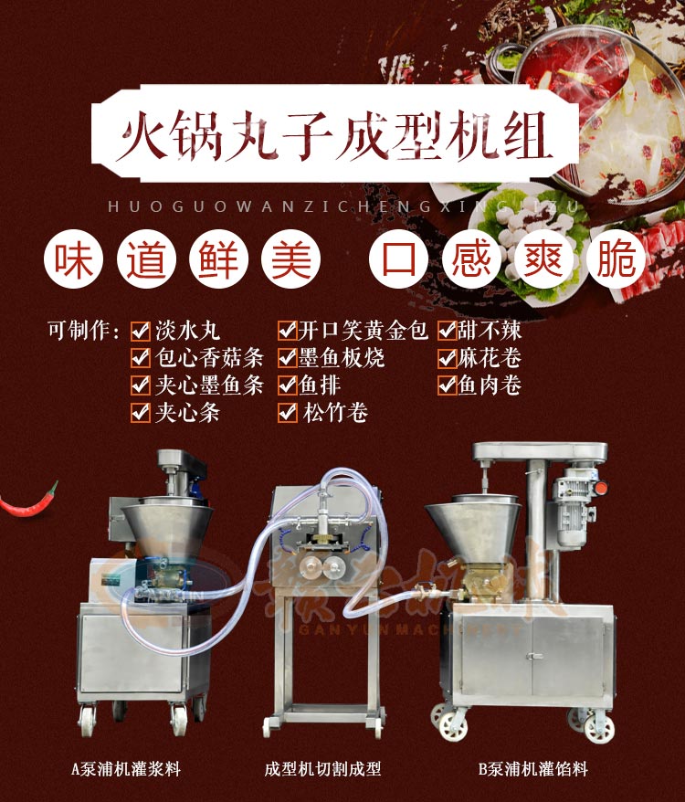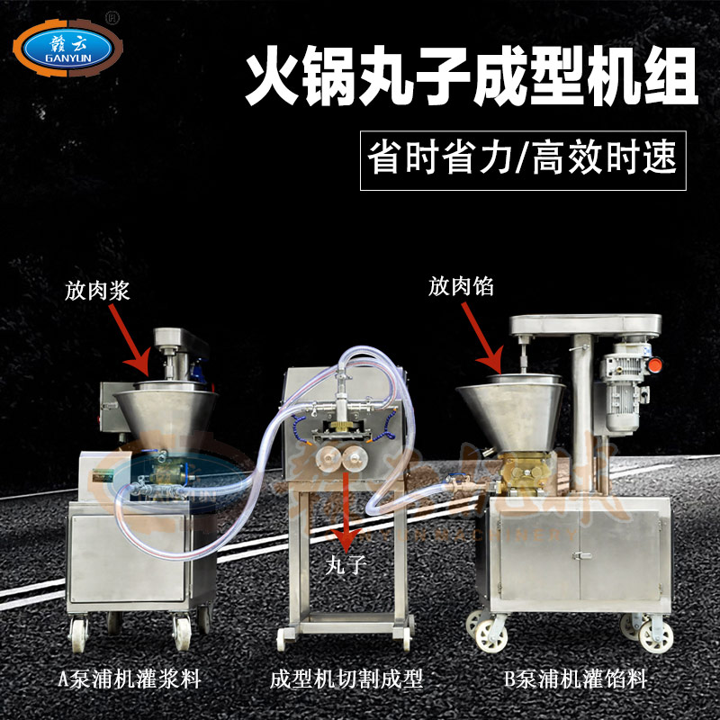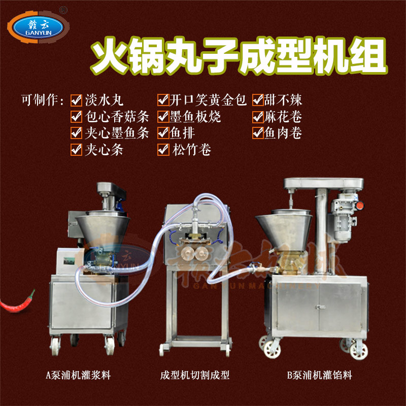 多功能火鍋料組合成型機組是由兩臺泵浦機和一臺火鍋料成型機組合而成,泵浦機起灌漿作用,火鍋料成型機起成型作用,本套成型機組可成型多種規格丸子,多種不同花色的丸子,又可稱為多樣丸子機,花樣丸子機,單色丸子機,多色丸子機等等。