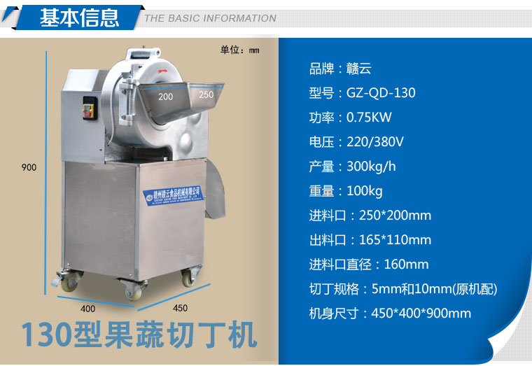 工作原理:GY-DQ-130型切丁機通過旋轉撥盤將被切物體帶動高速旋轉,利用物體的離心力,立刀將物體切成片狀,然后經過圓盤切絲刀片豎切成條狀,并將條狀物送入橫切斷刀口,由橫切斷刀盤切刀切成所需的長方體或立方體。