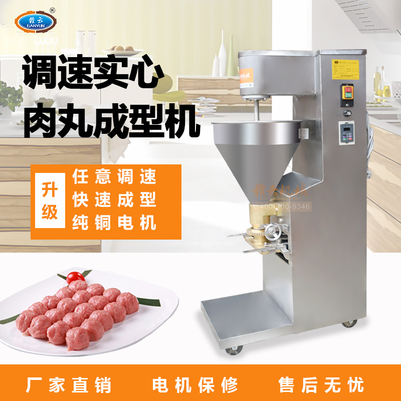 調速肉丸成型機是在實心肉丸成型機的基礎上,改開關控制為變頻數字調速控制,成型速度可變。是做實心豬肉丸、魚肉丸、牛肉丸成型不二選擇。詳細技術參數可參考實心肉丸成型機GY-SX-120型肉丸成型機。
