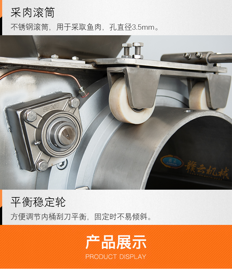 贛云牌350型魚肉采肉機采用全304不銹鋼,整體結構設計高端大氣,牢固耐用,性能穩定,各種調節裝置設計合理,人性化操作程度高,增加了潤滑軸承的功能。以下是這款機器的結構示意圖和實物拍攝細節圖等。