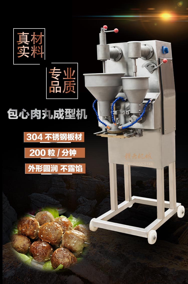 2014冬季新款包心肉丸機,第三代肉丸包心機保留了二代包心機的全部優勢外,在包心成型速度上做了本質上的突破,每分鐘成型200粒的速度是二代包心機的兩倍,機身表面接觸食物部位升級,特殊處理更耐氧化和腐蝕,由于速度上的重大突破,因而稱之為第三代包心肉丸機。