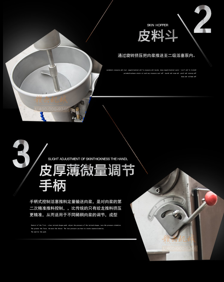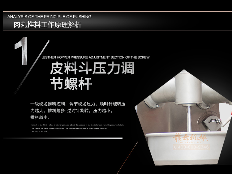 第三代包心肉丸機是在贛云二代包心肉丸機的基礎上,對二代包心機的成型切割部位進行優化提速處理,達到每分鐘200粒的成型速度是二代包心機的兩倍,且推料控制方式還是選用一級絞龍推料和二次泵定量輸送相結合的原理,餡料控制改塑料螺蓋為不銹鋼抗氧化特殊處理螺蓋,餡斗新增絞龍擋板,可有效防止肉餡余留餡斗,更易肉餡的向下擠壓輸送作用,成型旋轉齒輪上新增潤滑滴管,彌補了二代包心機成型區域局部潤滑切刀的缺陷,做出的包心包餡丸表皮光滑,個體圓且大,成型速度快,無小尾巴等優勢。綜上優勢pk二代和目前其他廠家新款式包心肉丸機,故稱之為贛云第三代包心肉丸機!