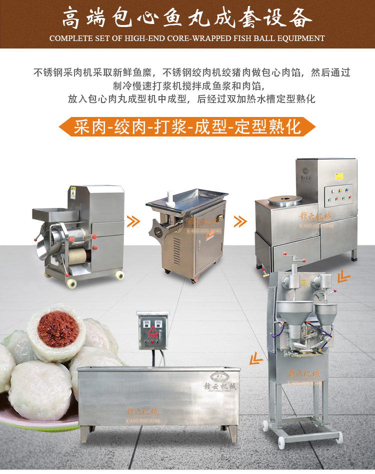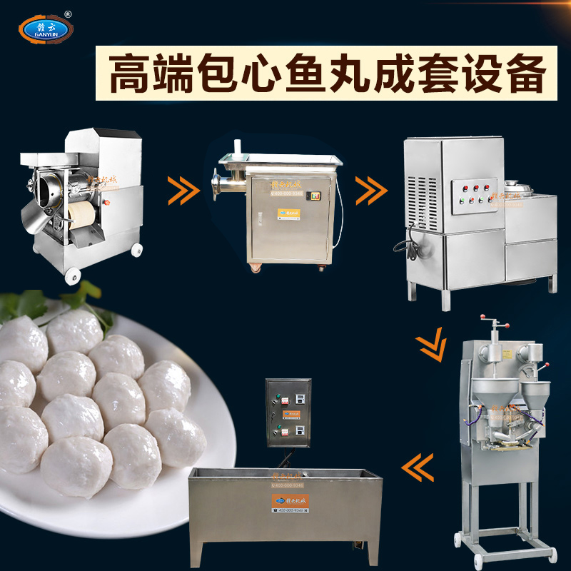 本套設備由:200型全不銹鋼魚肉采肉機、32型立式不銹鋼絞肉機、36型制冷慢速肉丸打漿機、三代肉丸包心機和智能溫控雙加熱水槽六臺設備組合而成。本套設備除了可以生產包心魚丸,還可生產實心魚丸