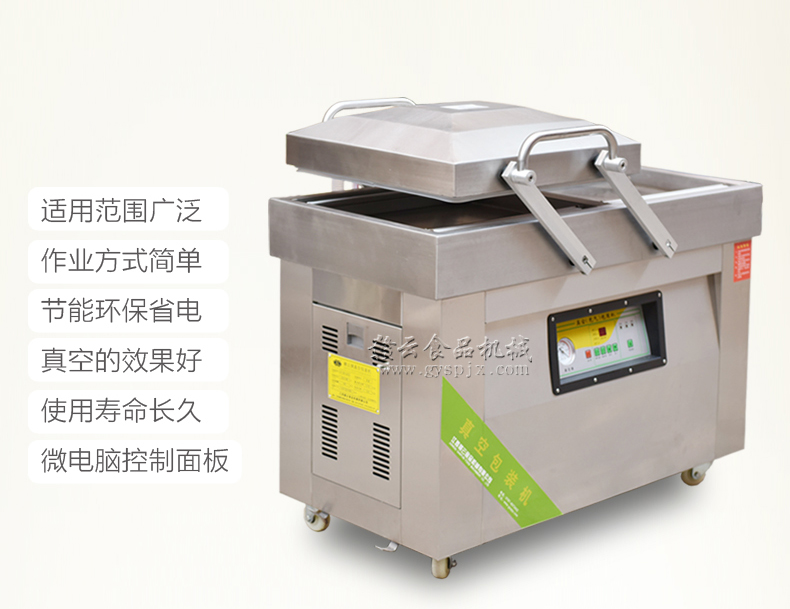 3、壓下真空蓋,面板上的抽氣指示燈亮,真空泵開始抽氣,機蓋即被自動吸引,抽真空時間可根據包裝要求調節適當時間。