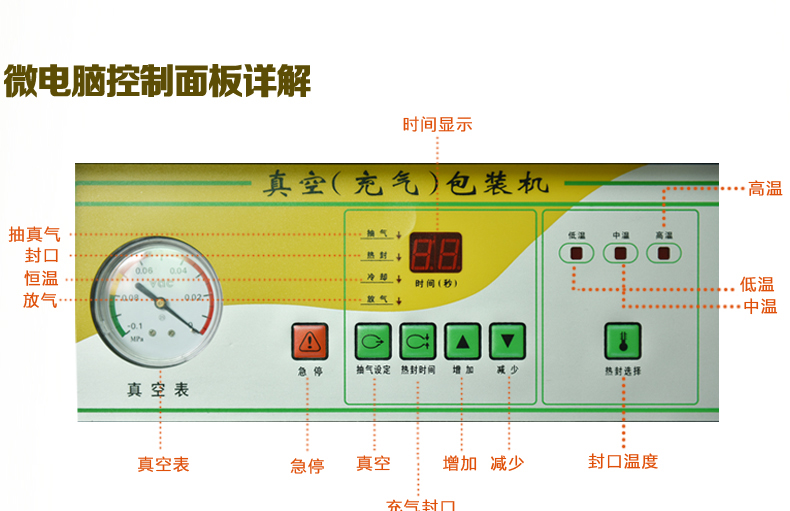 1、接通電源:開啟電源開關,即電源指示燈亮,設定抽氣時間、熱封時間、熱封溫度。