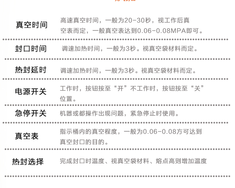 4、當抽氣時間達到預設定時間時,抽氣結束,指示燈隨之熄滅,熱封指示燈亮,此時電磁閥工作,進入封口程序,面板上舍友熱封時間及溫度調節按鈕,以適應不同厚薄的材料,調節時間及溫度應注意一定根據所需的包裝袋規格來調整。