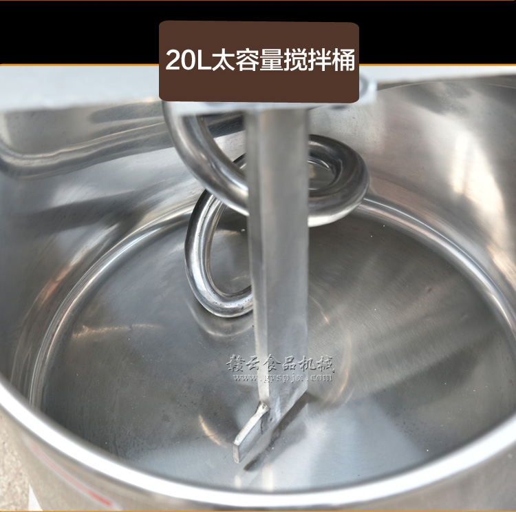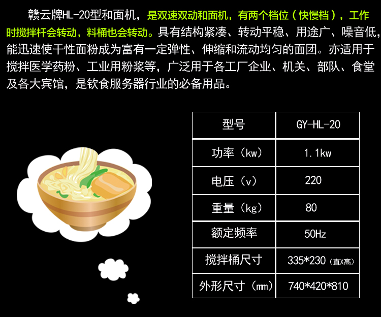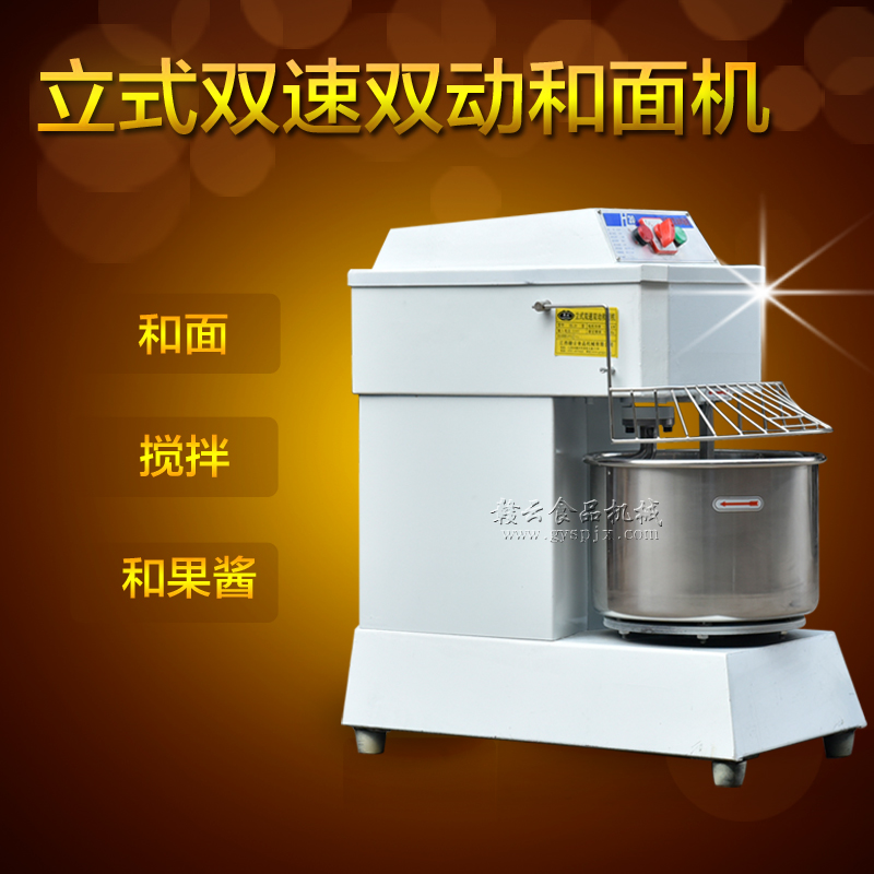 贛云牌HL-20型和面機,立式雙速雙動型和面攪拌機,有兩個檔位(快慢檔),工作時攪拌桿會轉動,料桶也跟隨轉動。具有結構緊湊、轉動平穩、用途廣、噪音低,能迅速使干性面粉成為富有一定彈性、伸縮和流動均勻的面團。亦適用于攪拌醫學藥粉、工業用粉漿等,廣泛用于各工廠企業、機關、部隊、食堂及各大賓館,是飲食服務器行業的常見用品。我廠常規批量生產供應的雙速雙動和面攪拌機有20L和30L兩種型號,如需更大規格可定做,如60L、80L,歡迎來電咨詢:電話0797-8373422