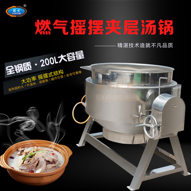 燃氣加熱湯鍋,熬湯鍋,不銹鋼200L大容量湯鍋適用于食堂餐飲連鎖企業,夾層鍋,每小時耗氣量約2.7kg, 天然氣耗氣量為6立方,搖擺式湯鍋