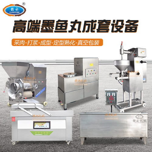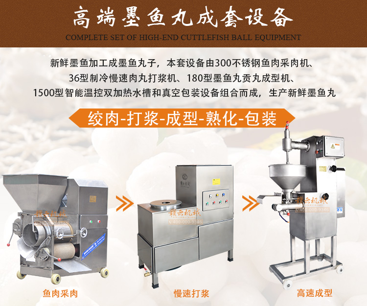 墨魚丸成套,新鮮墨魚加工成墨魚丸設備,墨魚丸機,本套設備由300不銹鋼魚肉采肉機、36型制冷慢速肉丸打漿機、180型墨魚丸貢丸成型機、1500型智能溫控雙加熱水槽和真空包裝設備組合而成,生產新鮮墨魚丸