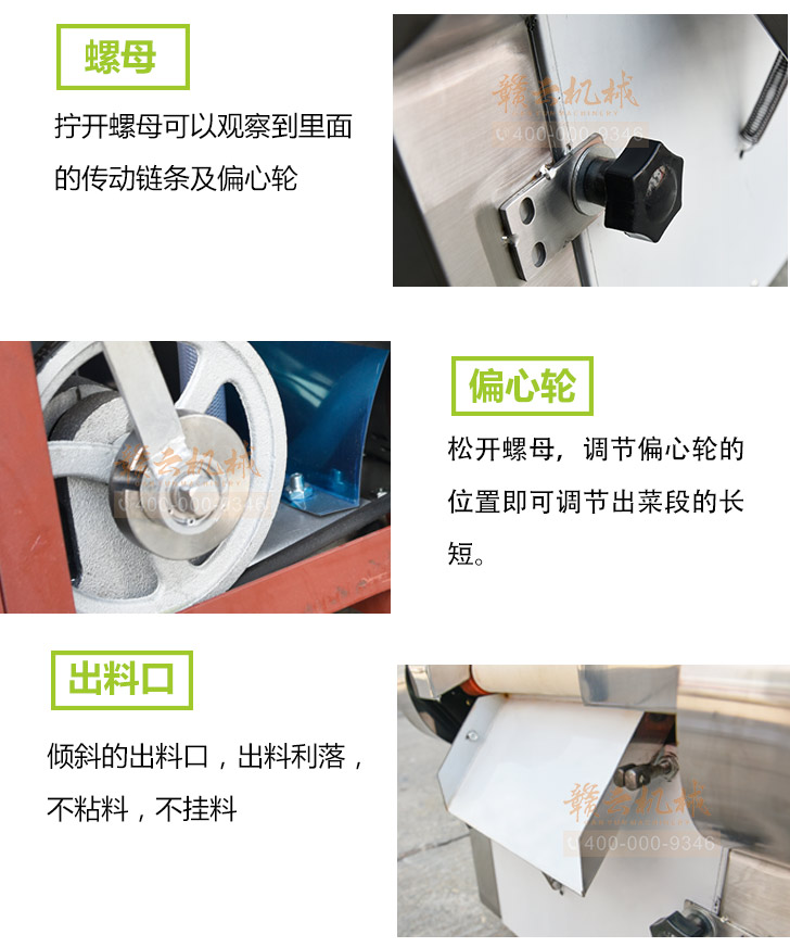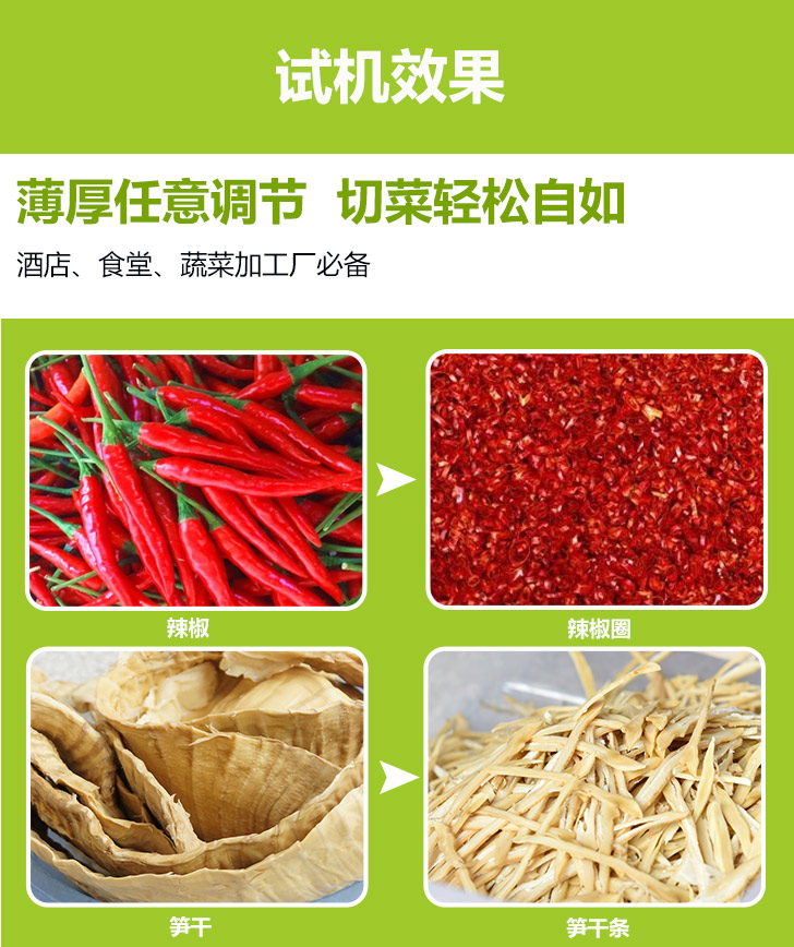 4、蘆薈粒、蘆薈條。改變切刀與送料槽安裝角度為專斜切機將根莖類蔬菜:如馬鈴薯、蕃薯、黃瓜、竹筍、洋蔥、茄子等切片、條、丁,適合衛生餐飲人員或食品加工廠使用. 用途:葉菜類:可切芹菜、大白菜、高麗菜、菠菜、蔥、大蒜、瓜類等長條狀之物切成片、絲、段狀,適合食品加工業者配合自動化生產線。