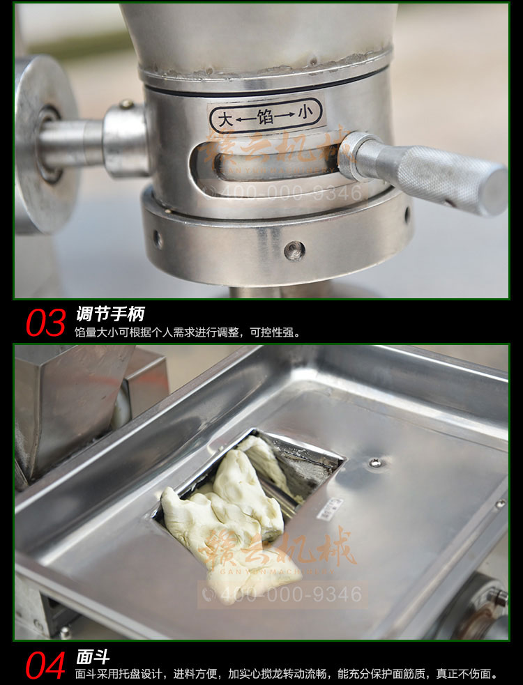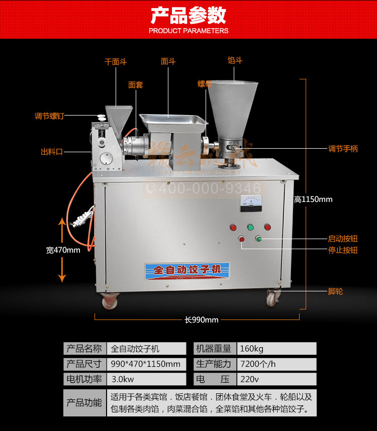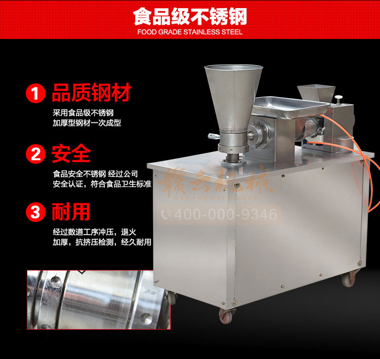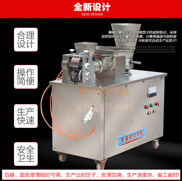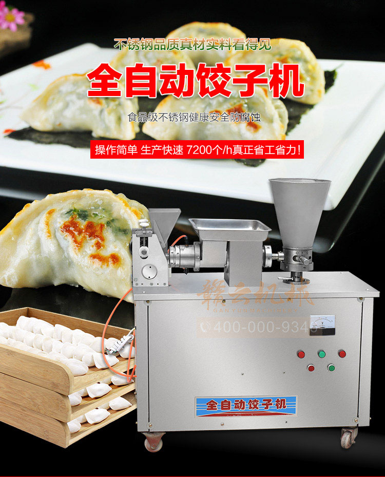 食品級材質全自動餃子機,操作簡單,容易入門,生產效率:7200個/h,讓您省工少力,該款電動餃子機可生產肉餡、肉菜混合餡、全菜餡餃子等各種風味i不同的餃子!口味隨心搭配