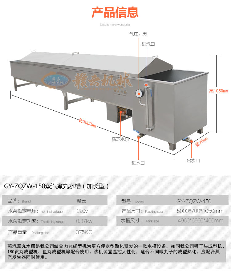 主頁-> 肉丸成型機械->自動煮丸子水槽->5米水煮槽蒸汽款