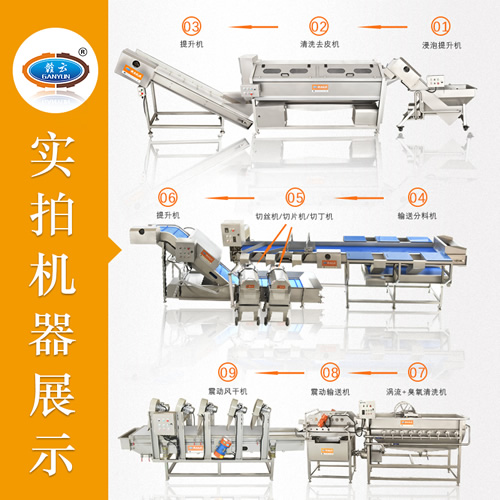 球根莖瓜果處理流水線,實現瓜果類食品從挑選清洗到切割成品風干整個自動化流程,特別適合中央廚房打造機械快速化自動設備。