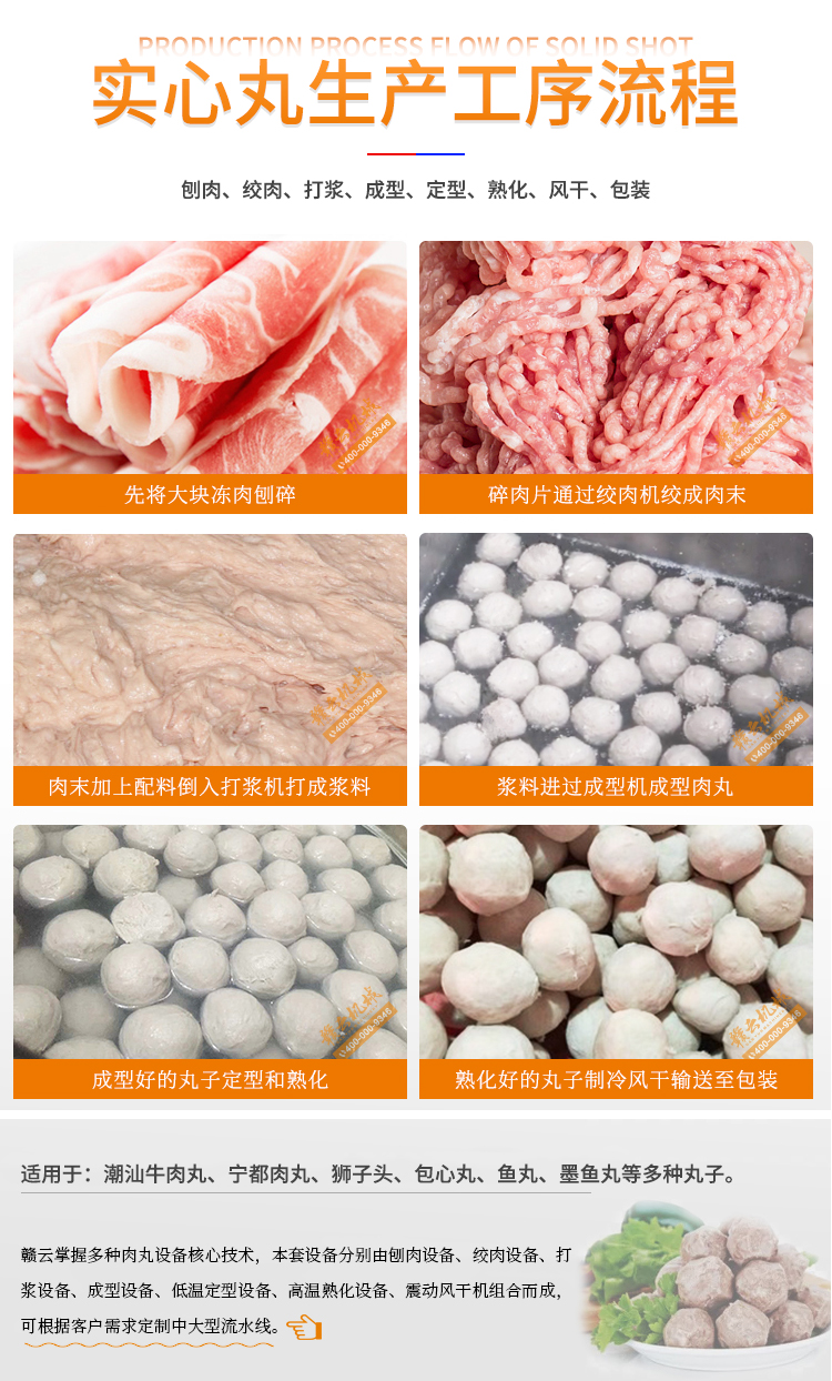 整套肉丸生產流水線設備自動化程度高,加工量大,非常適合食品加工廠,肉丸生產企業使用,我公司可以根據您的需求定制各種規格的機器設備。整條流水線可以生產肉丸,雞肉丸,墨魚丸,牛肉丸,魚丸等丸子,多功能加工設備。