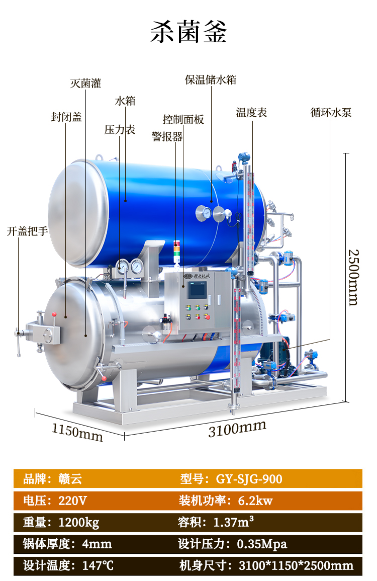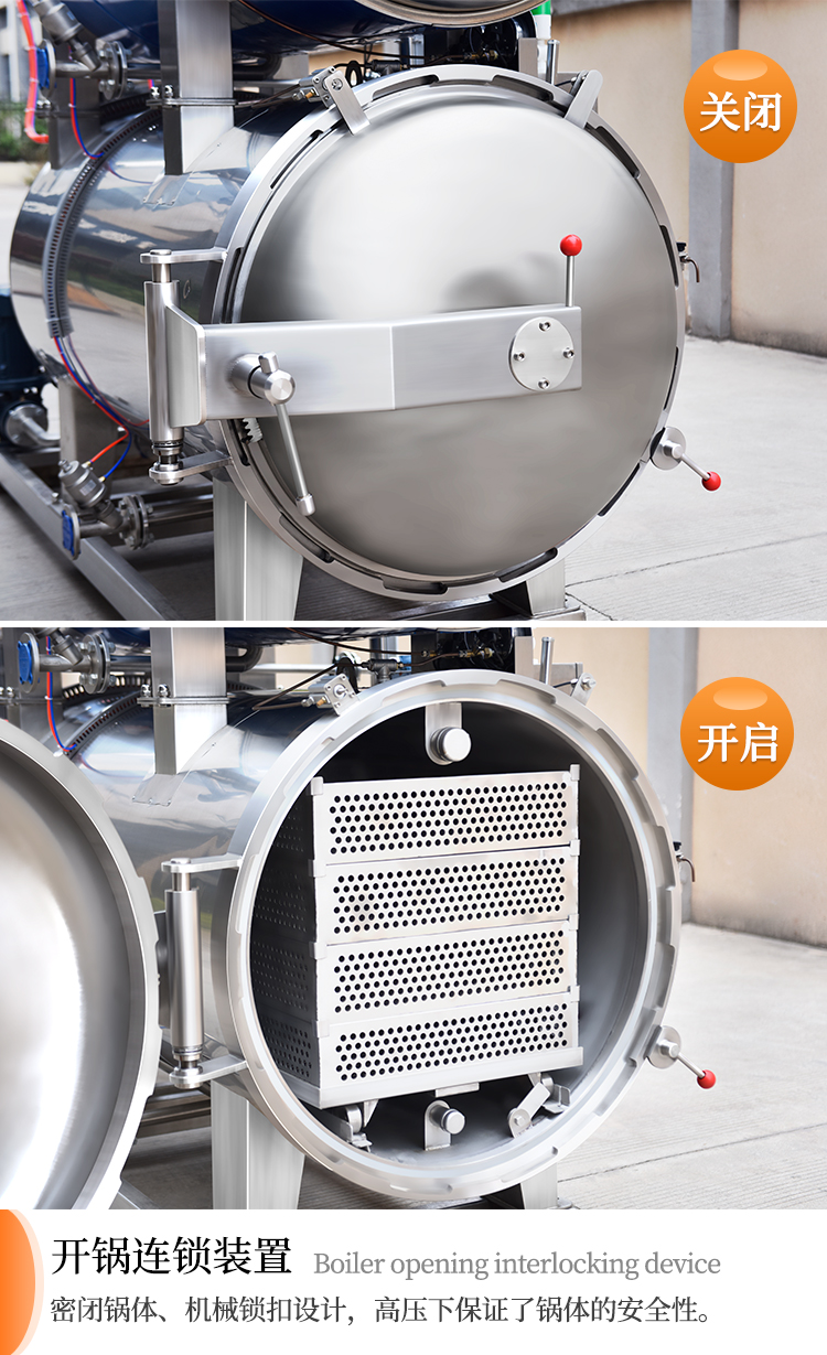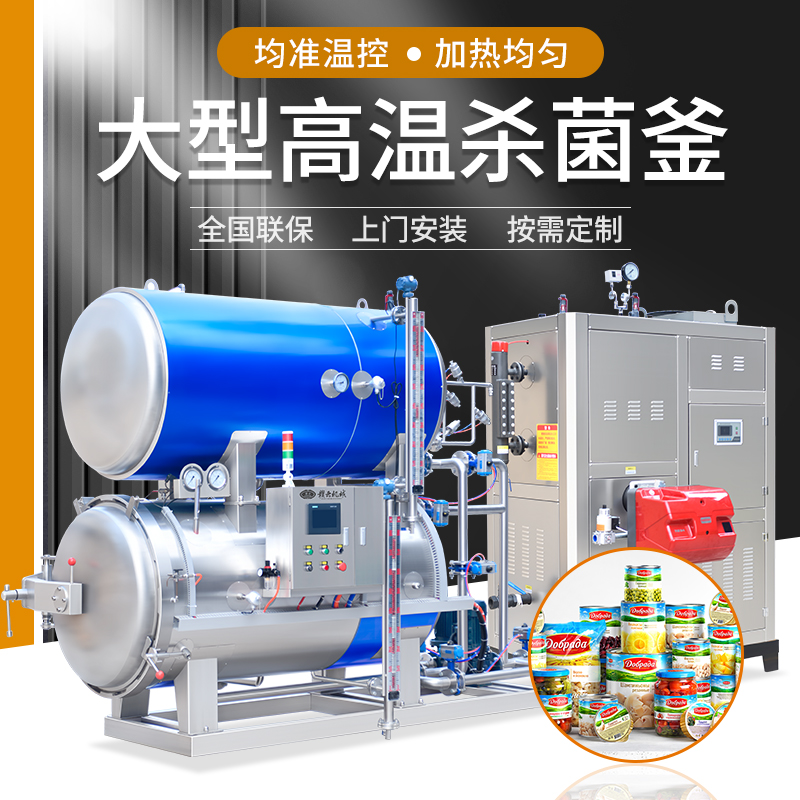 高溫殺菌鍋(殺菌釜)利用鍋內轉換的熱水循環,浸泡式高溫滅菌,在工作的過程當中高溫殺菌鍋心對鍋內的溫度壓力、殺菌時間、進汽、排汽、進水排水等過程,設備全部采用電腦自動化控制,使鍋內所有區域溫差在0.3度左右,確保生產出來的產品的色澤、口味、營養成分不會改變,適用于罐頭(如:肉類、魚類、蛋類、蔬菜類、粽子等罐頭) 及需要高溫用殺菌的蛋白飲料(如:馬口鐵罐、玻璃瓶罐頭、蒸煮袋等):特別適合罐頭類(如:火腿腸、蒸煮袋裝雞、扒雞、純牛奶等)