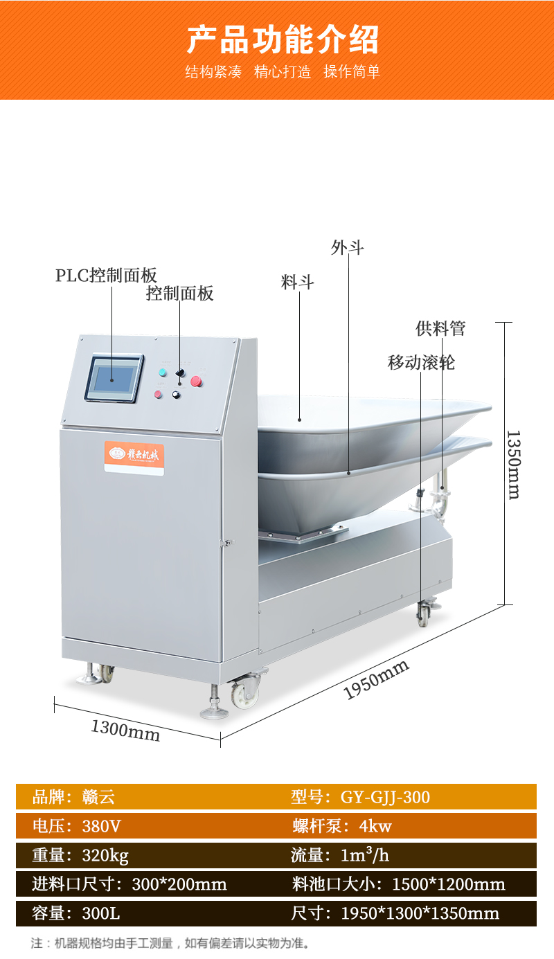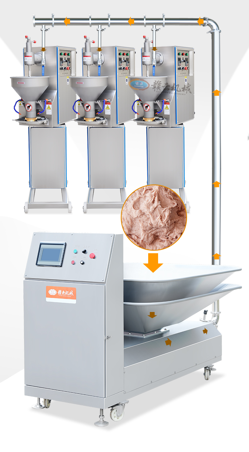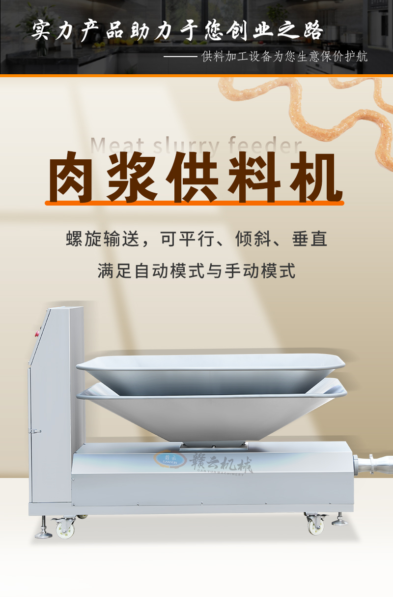 肉漿供料機通過不銹鋼單螺桿進行精準供料,適用于魚丸、牛肉丸、火腿腸等全自動生產線時供料,整體供料穩定,輸送平衡,在連續供料時不會破壞漿料顆粒纖維,能有效提升工廠自動化程序。