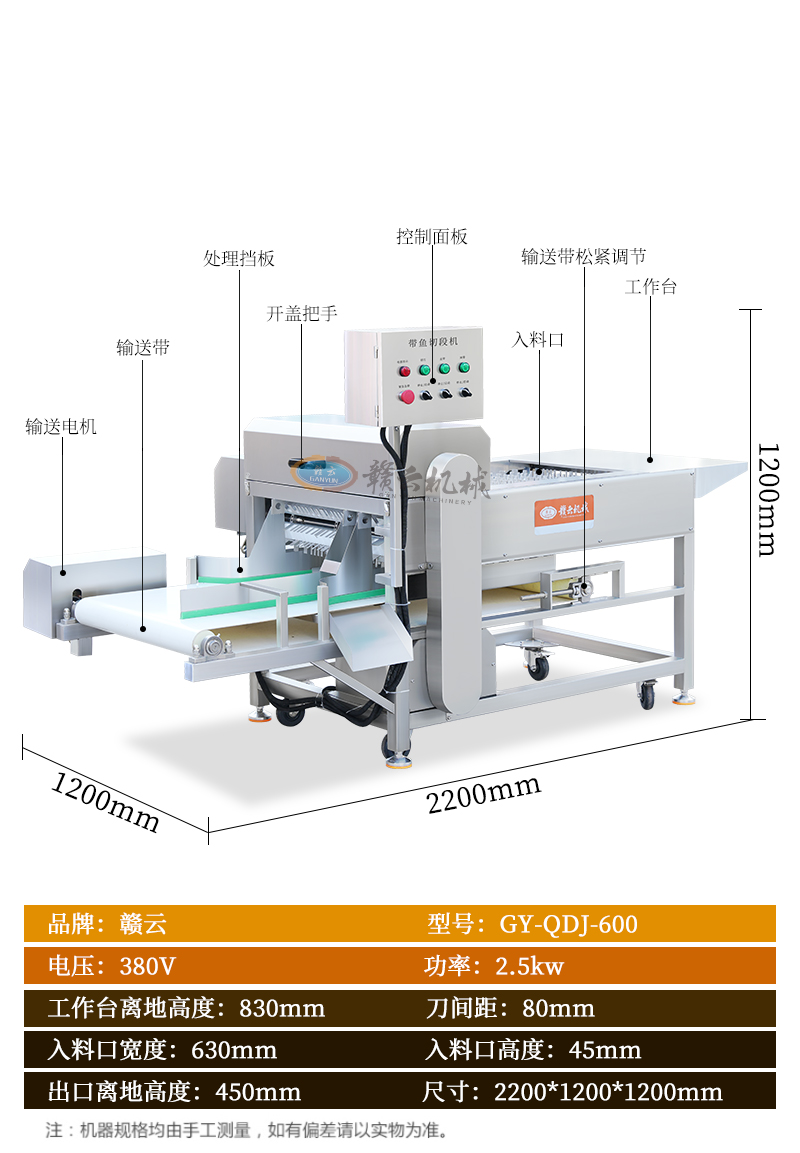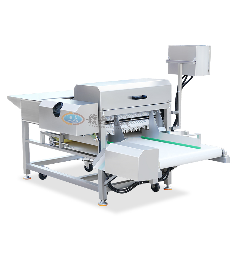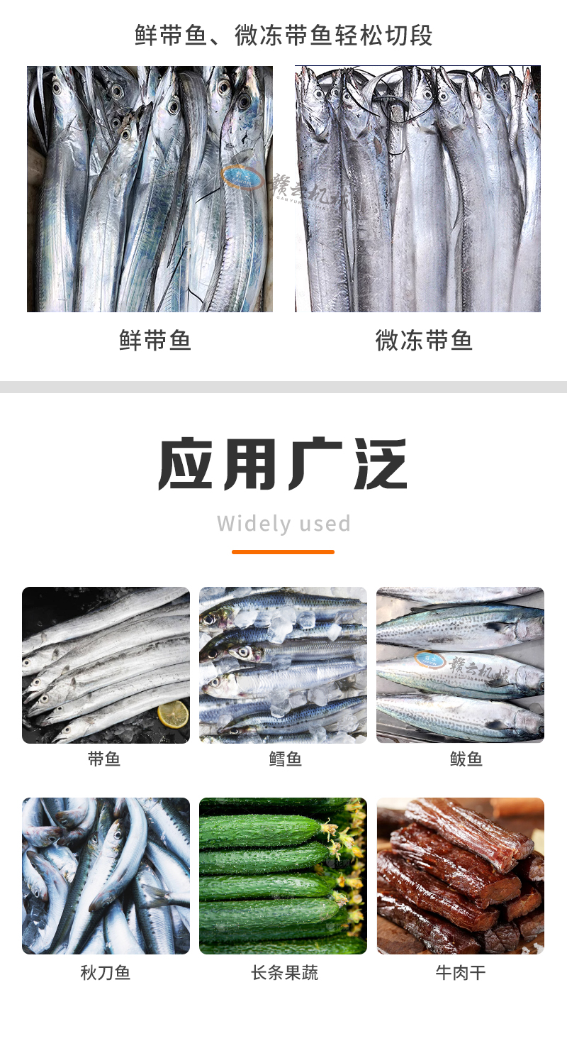 適用于鮮帶魚、微凍帶魚、秋刀魚、鱈魚、鲅魚、海帶、肉干、長條果蔬、鮮肉等長條物料快速切段。