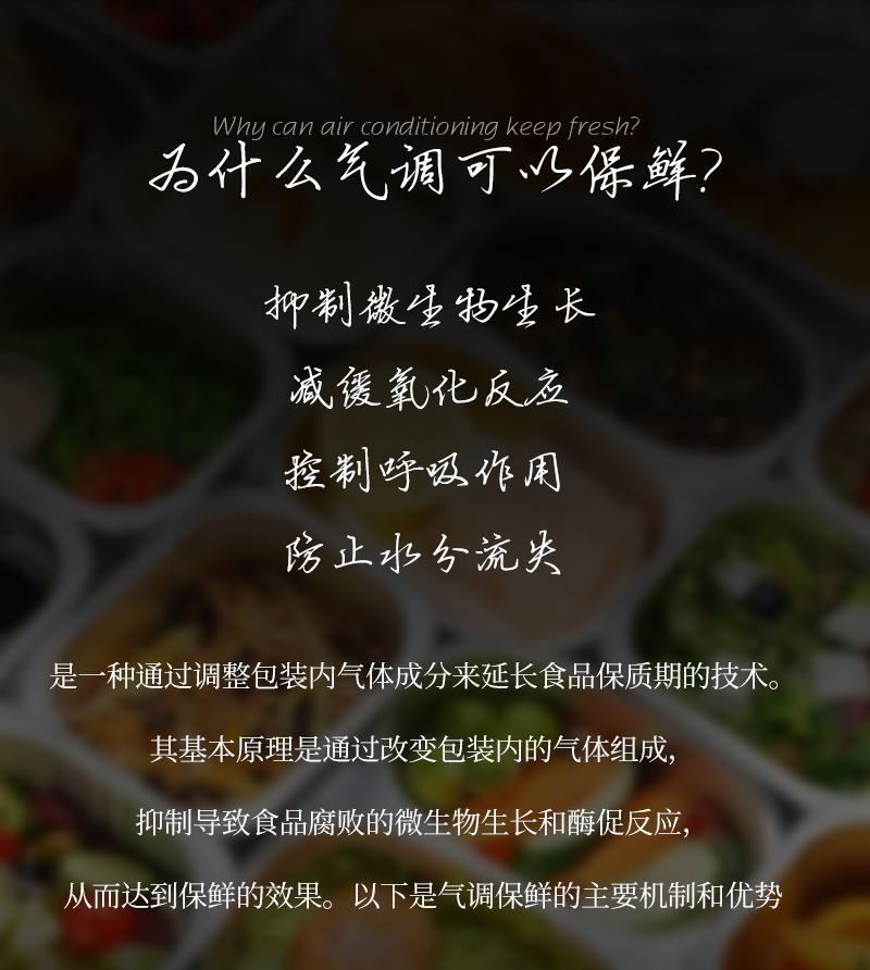 用于預制菜、熟食、果蔬等食品氣調保鮮包裝,通過調整包裝內氣體成分延長保鮮期,保持色香味及營養。