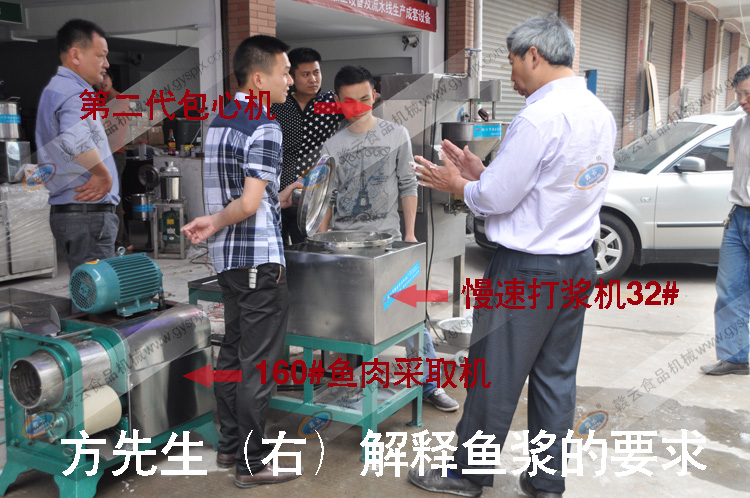 2012年5月5日上午,贛云接待了來自湖北魚丸生產的方先生,按照方先生自家包心魚丸生產配方的需求,購買了40多斤魚,等比例淀粉,豬肉5斤,生姜若干,鹽一包,其他配料若干。本次試機演示了4臺設備用于制作包心魚丸,以下是試機過程實拍圖片。