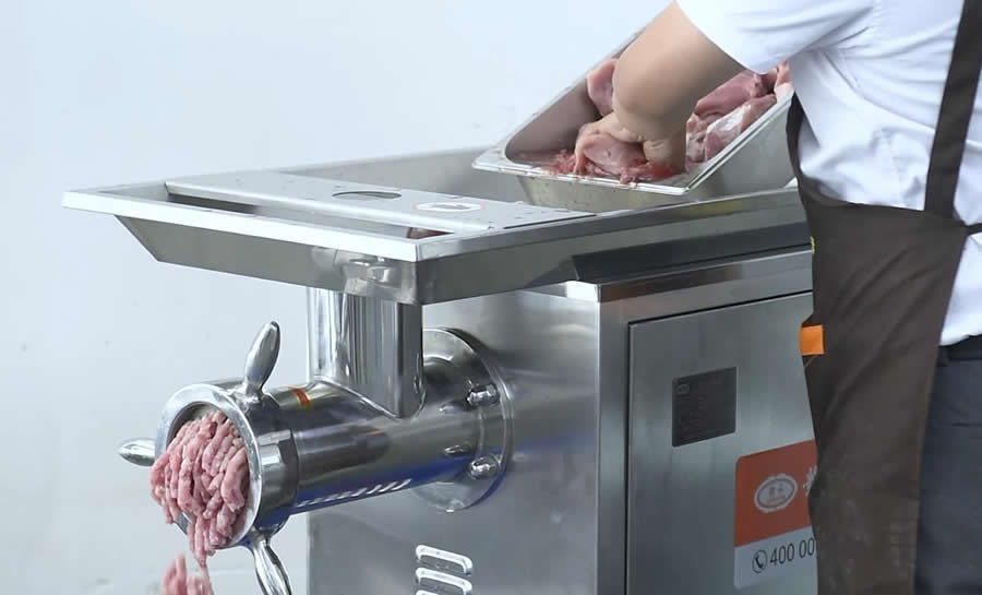 首先將所有原料準備好,原料有:鮮豬肉(比例為:瘦6肥4)、胡蘿卜、生姜、小蒜、馬蹄、淀粉、冰水等。第一步是需要將原料通過絞肉機絞碎,這一步是使用贛云42型不銹鋼絞肉機,這臺機器可以用于鮮肉、微凍肉類、蔬菜等絞碎,機器動力強勁,絞肉速度快,每小時可達600公斤。