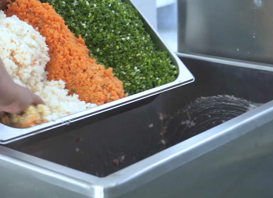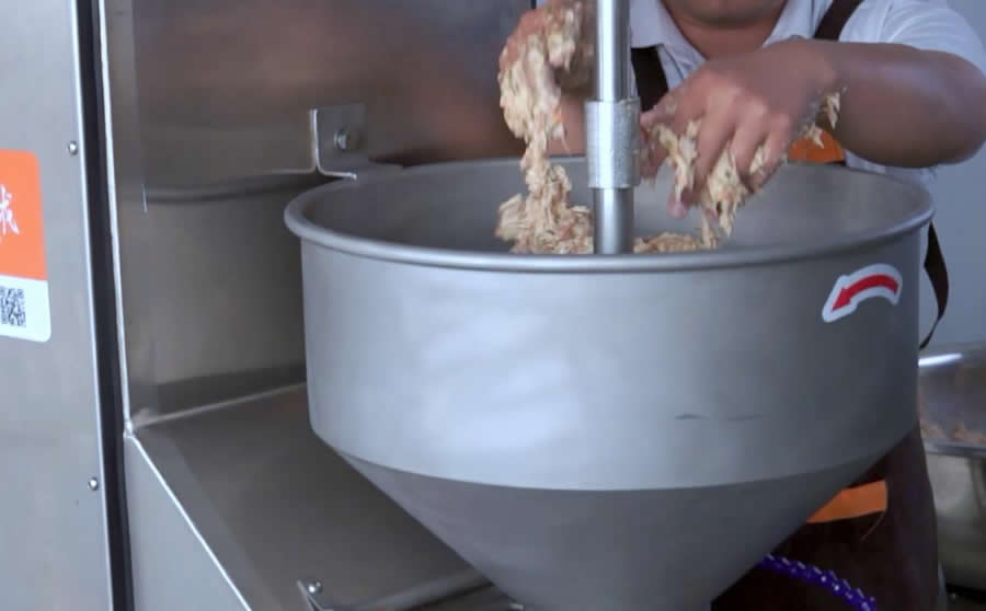 將通過絞切處理后的食材根據工藝比例倒入這臺自動化不銹鋼拌餡機。拌餡機可對粒狀、粉狀、泥狀物料根據需求設定攪拌時間,機器擁有5槳交錯攪拌,操作過程中可自動切換正反轉,這臺機器單次一桶可加工100L物料。