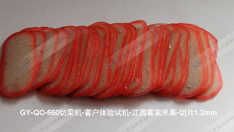 贛云牌多功能切菜GY-QC-660型切江西客家米果片,來自江西龍南縣客戶要求厚度在1.2-1.5mm之間,該設備可切范圍0-20mm,試機成功。