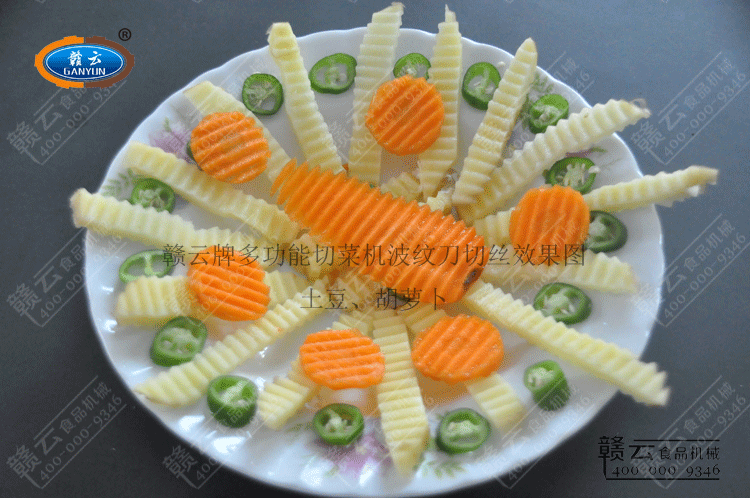 贛云牌多功能切菜機安裝波紋型刀具切出波浪形效果。以胡蘿卜和土豆為例,經過離心切片后切波浪型效果展示圖: