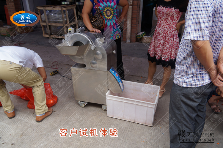 贛云牌130型果蔬切丁機迎來客戶新體驗,贛南地區某商戶加工土豆、胡蘿卜、香芋等,尋求能切15mm丁,5mm絲的機械設備,贛云工作人員為其推薦了130型果蔬專用切丁機,切丁刀組完全安裝,切出來就是丁,跟換切絲刀組就能切不同規格的絲了,試機效果良好,符合客戶加工需求。