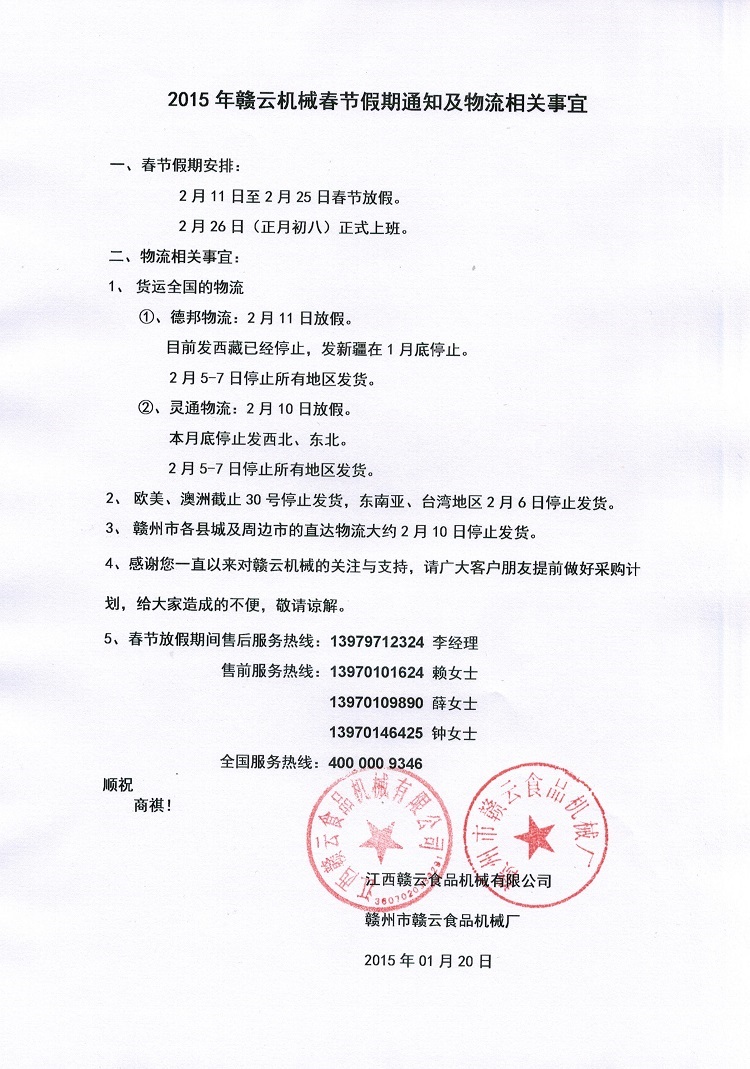 2014年終物流停運通告與2015年春節假期通知