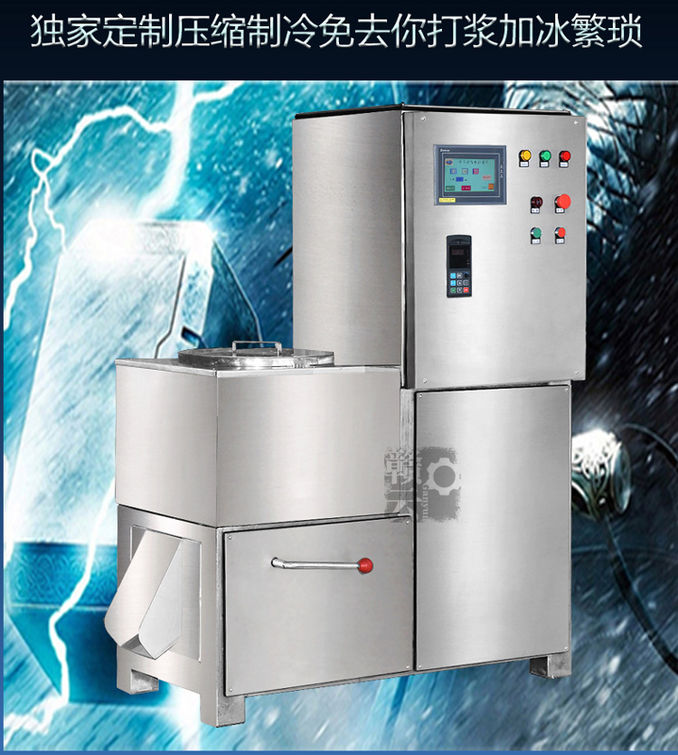 全封閉外觀設計,高端大氣,壓縮制冷系統管道纏繞打漿桶外壁,直接與打漿桶接觸,制冷效果更佳,靈敏的溫控感應系統,溫度達到預設溫度時,系統自動報警停機,可有效防止打漿過程因溫度過高損壞肉類組織細胞,三種刀速配合三種刀組,因輸出功率大小不一,因此程序還預設了負載報警系統,防止高速制動啟動卻安裝了低速刀,因輸出功率差別大而損壞電機。