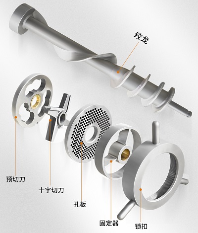 設備使用后的清洗工作也很簡單:先將出料口的鎖口松開,然后取下十字刀、孔板、預切刀、絞龍等配件放入清水池中清洗,使用熱水效果更佳。然后,用清水將入料口和出料口進行沖水清洗,將所有散落的肉渣沖洗干凈。