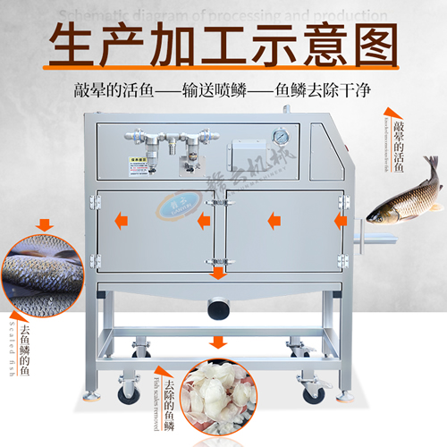 經過暫養后的鮮魚在進入去麟這一環節需要用到這款高壓去魚麟設備,通過高壓水噴射的方法去除魚鱗,以達到不損傷魚頭和魚身,保障了食材的完整度。這臺設備操作簡單,去麟干凈,且對魚體損傷小。