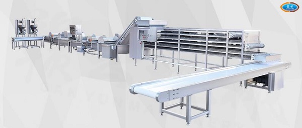 將新鮮成型的魚丸傳輸到低溫定型線上,通過控制設備的溫度達到低溫冷卻魚丸的效果,增加魚丸的質感。